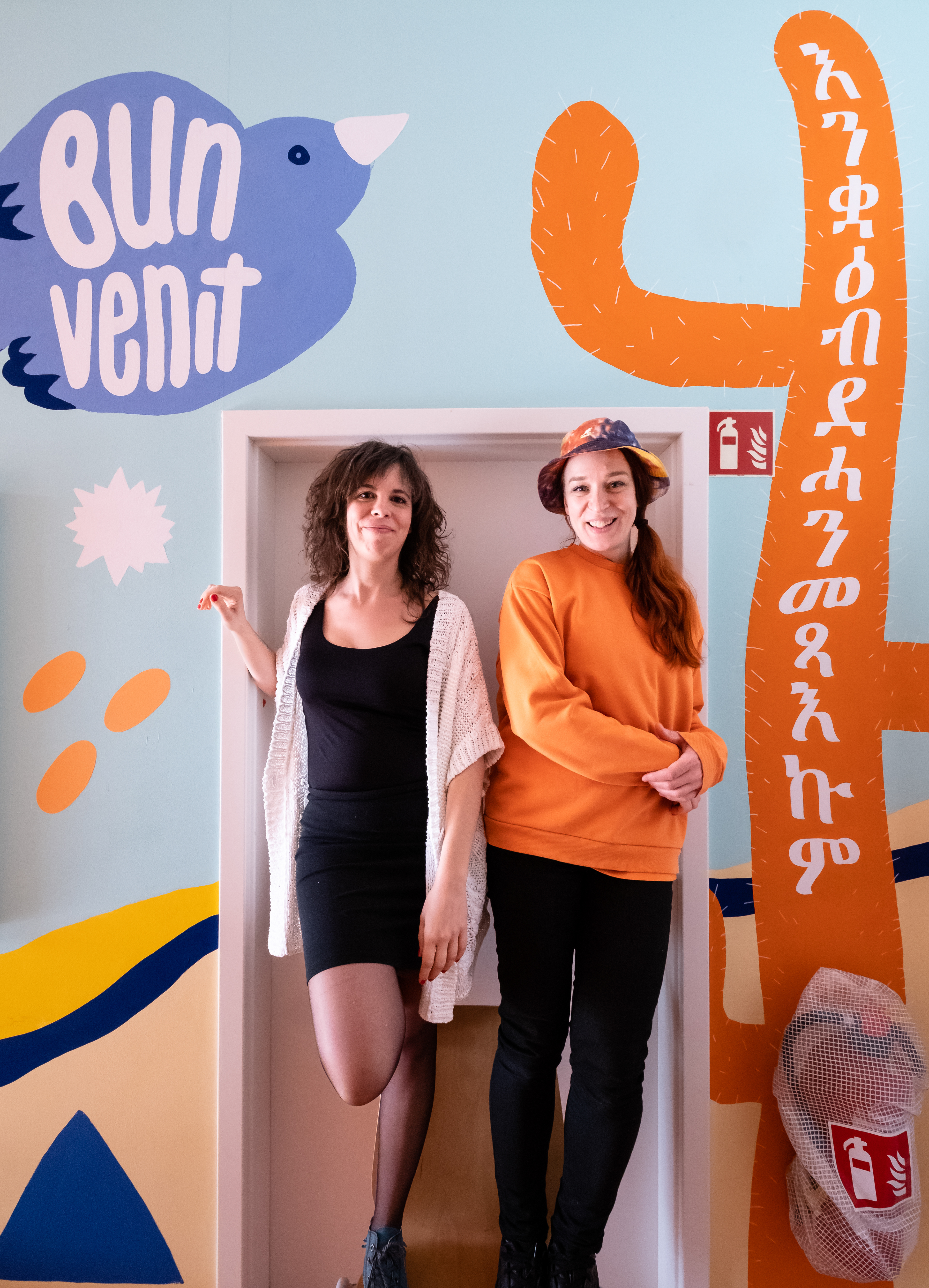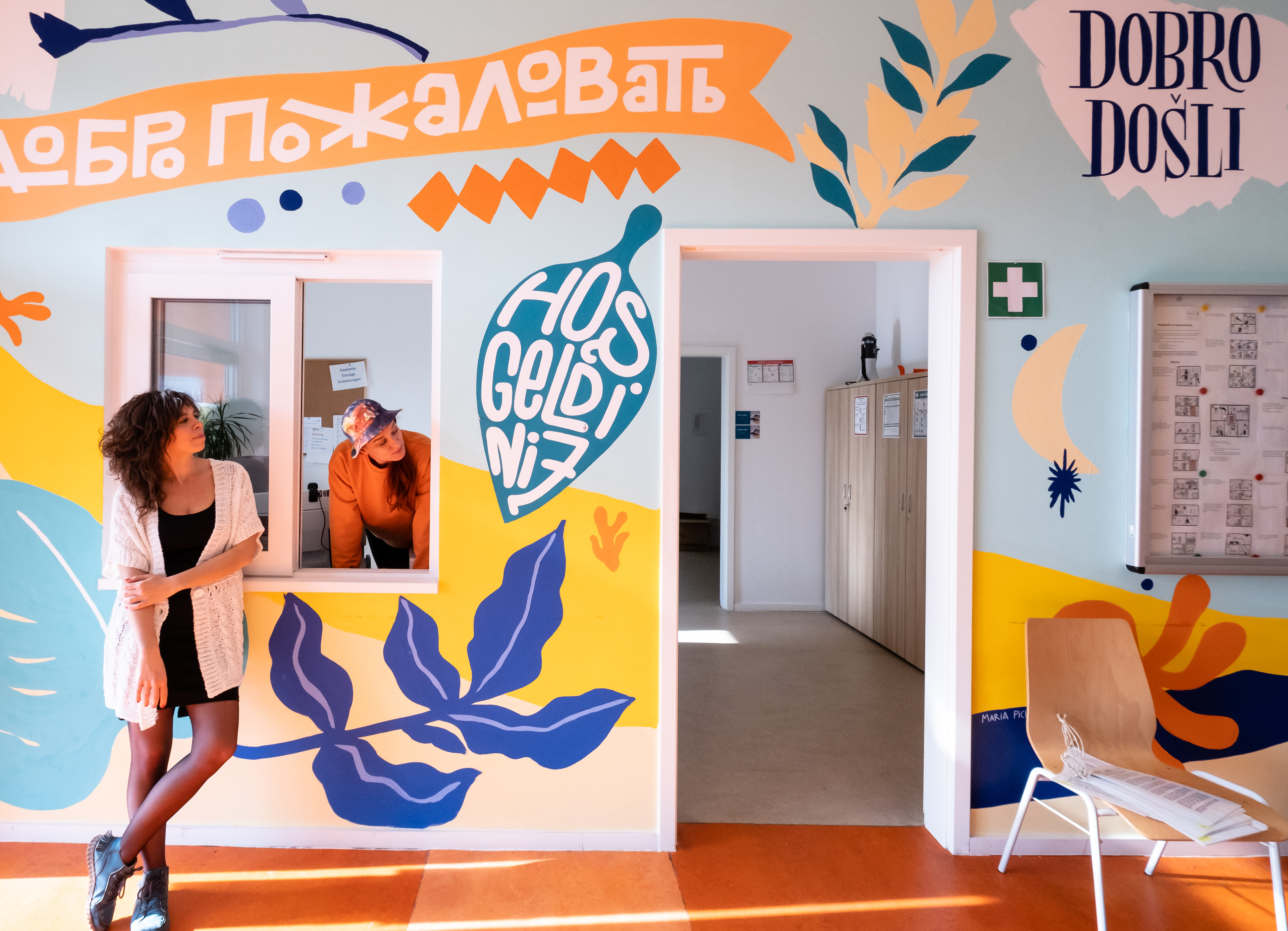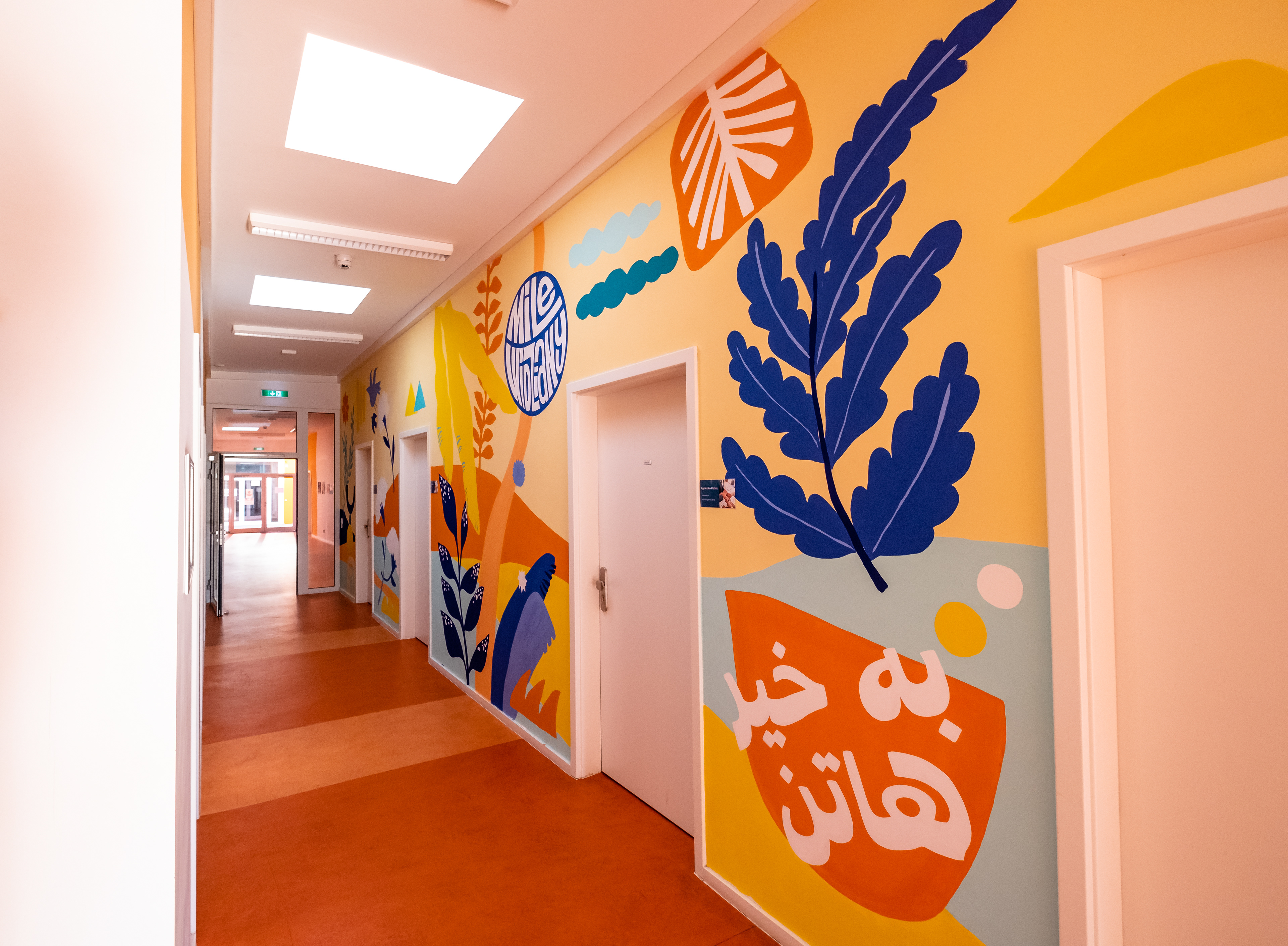 We were invited with the illustrator Maria Pichel to the GU Haarlemer str. refugee accommodation in Berlin to paint a mural expanding the whole hallway of 25 meters. The purpose of the painting is to welcome everybody and it does so in 10 different languages (all sketched and hand-lettered by me) with Maria's cheerful illustrations, painted by hand during less than one week.