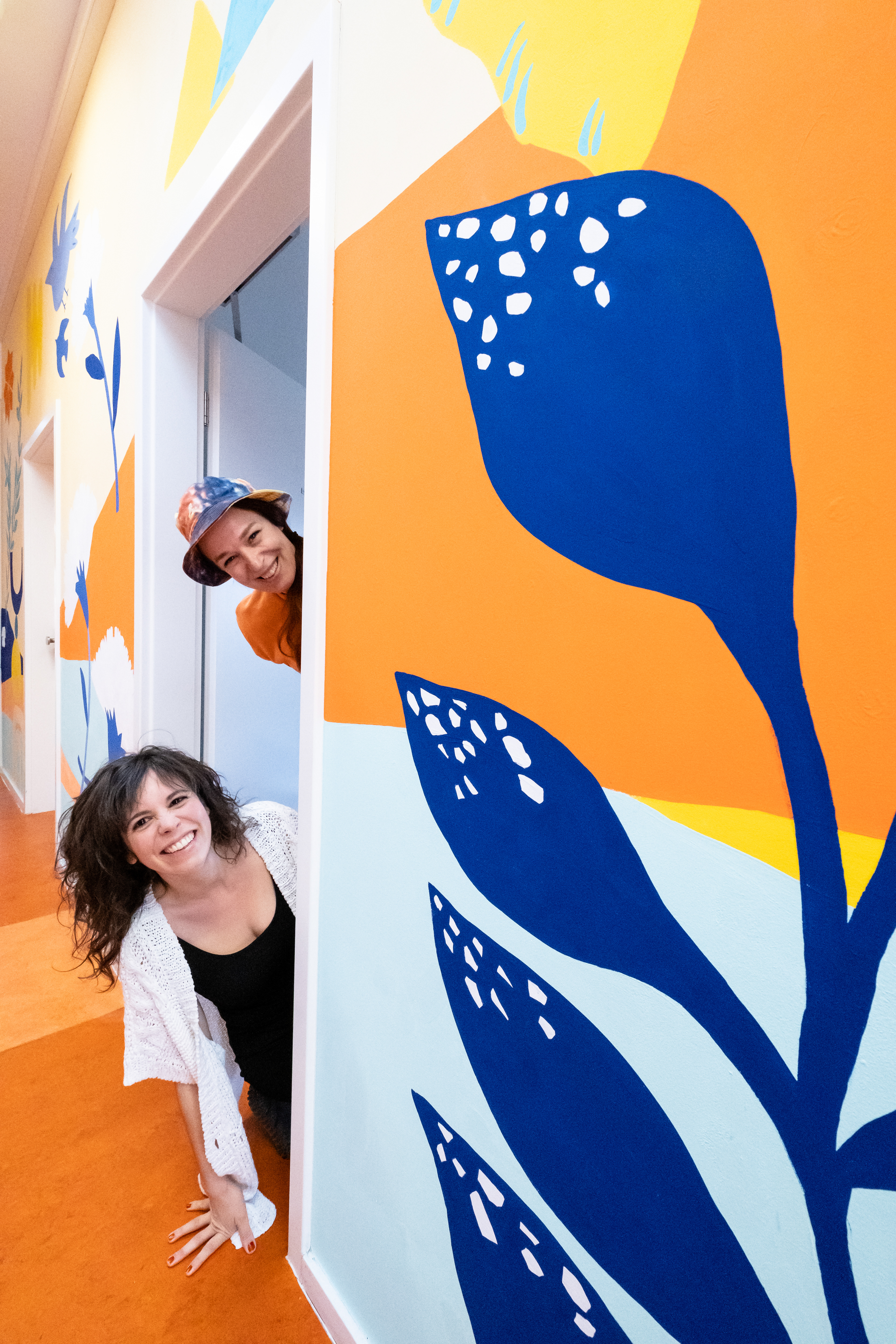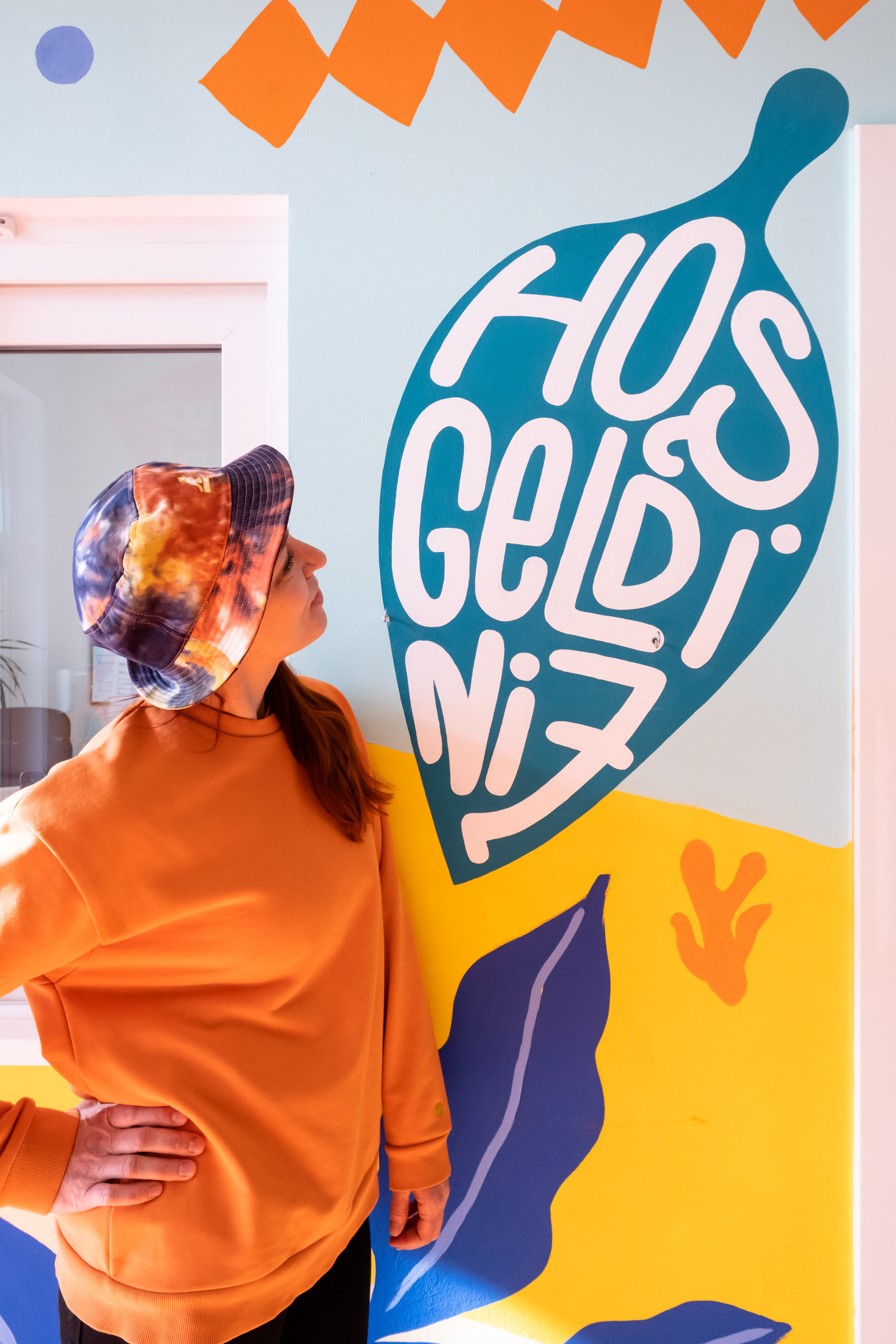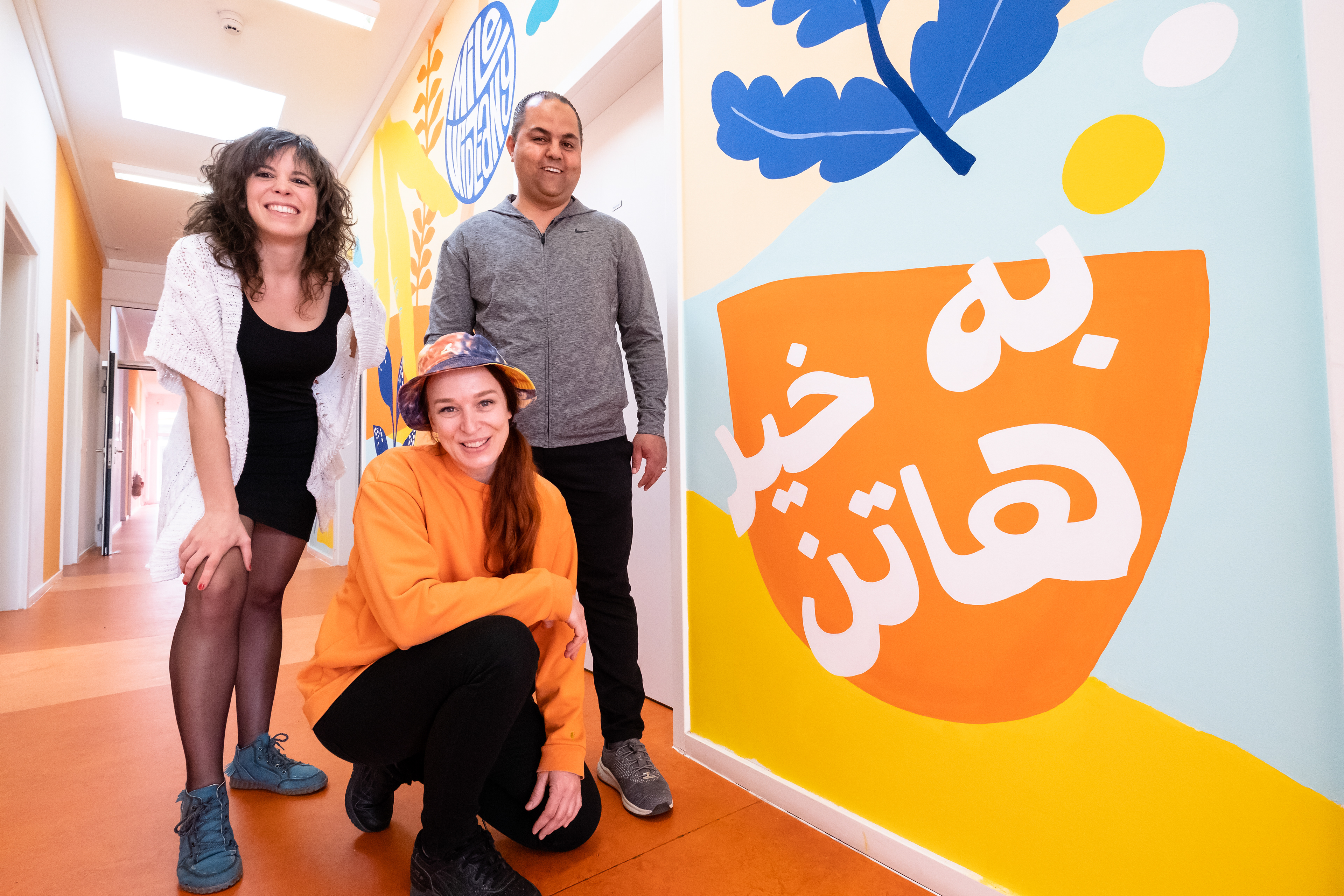 We were invited with the illustrator Maria Pichel to the GU Haarlemer str. refugee accommodation in Berlin to paint a mural expanding the whole hallway of 25 meters. The purpose of the painting is to welcome everybody and it does so in 10 different languages (all sketched and hand-lettered by me) with Maria's cheerful illustrations, painted by hand during less than one week.