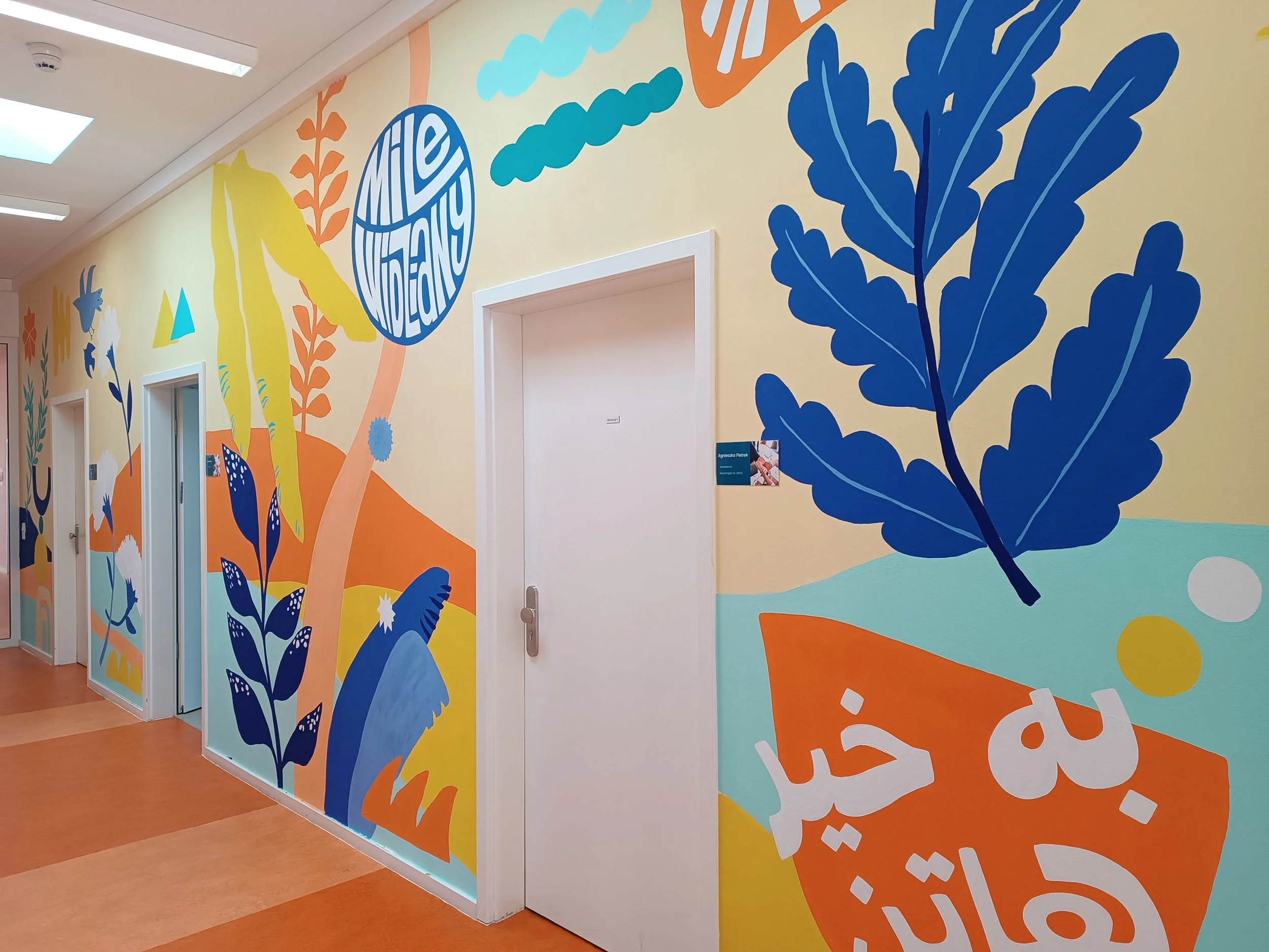 We were invited with the illustrator Maria Pichel to the GU Haarlemer str. refugee accommodation in Berlin to paint a mural expanding the whole hallway of 25 meters. The purpose of the painting is to welcome everybody and it does so in 10 different languages (all sketched and hand-lettered by me) with Maria's cheerful illustrations, painted by hand during less than one week.